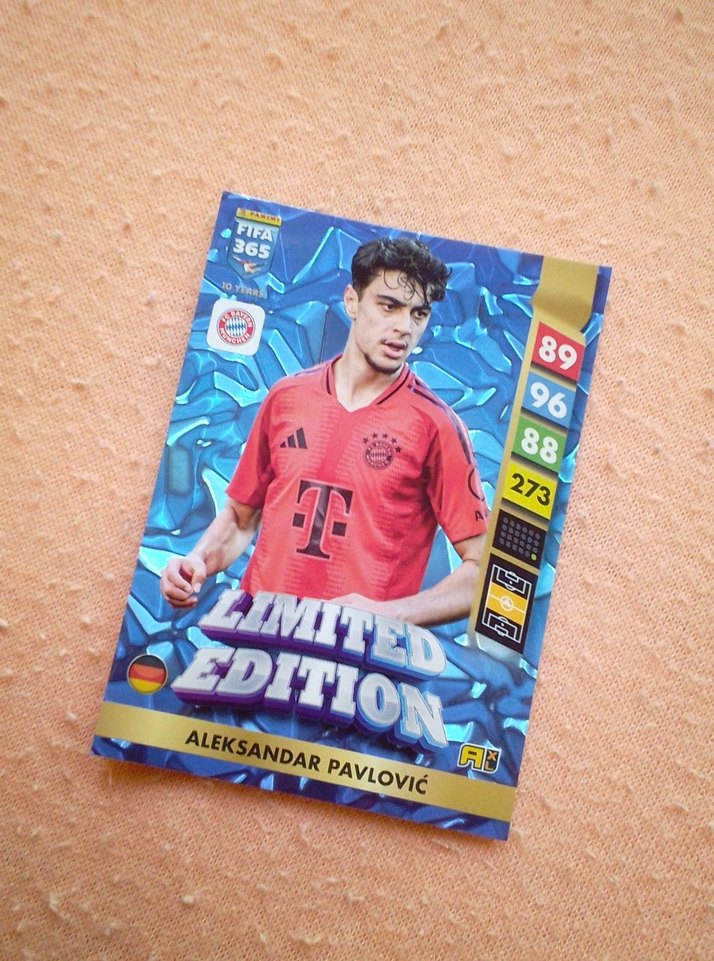 Aleksandar Pavlovic sınırlı baskı spor kartı, oyuncu istatistikleri ve Bayern Münih formasıyla. Yüksek kaliteli baskı ve resmi FIFA 365 logosu içerir. ⚽