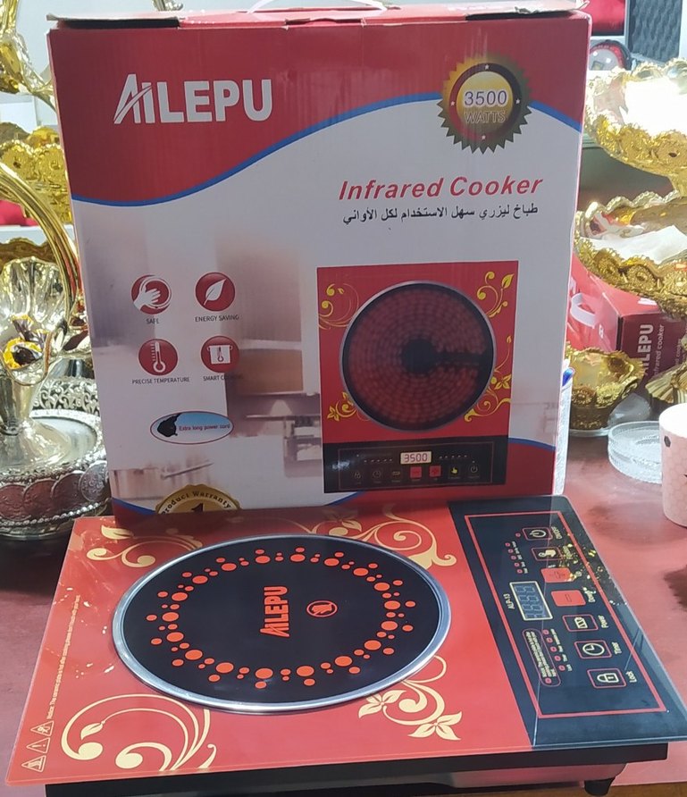 ALEPU kızılötesi ocak, 3500W güç ve kırmızı renkte tasarıma sahiptir. Verimli pişirme için infrared ısıtma ve kullanımı kolay kontrol paneli içerir. ️