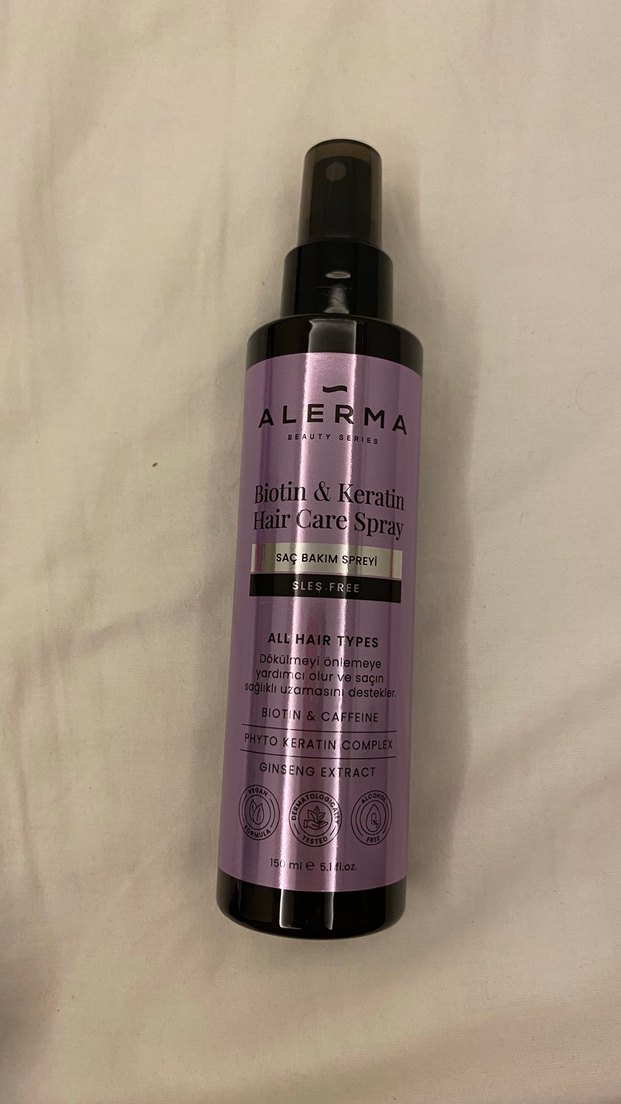Alerma Biotin & Keratin Saç Bakım Spreyi, saç dökülmesini önlemeye ve saç derisini desteklemeye yardımcı olur. Tüm saç tipleri için uygundur, biotin, kafein ve ginseng özü içerir. Hiç kullanılmamıştır