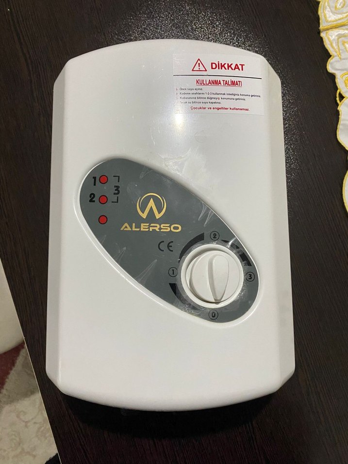 Alerso ısıtıcı, beyaz ve gri renkte, ayarlanabilir ısı ayar düğmesine sahip. Güvenlik sistemli,tüp rezistans, anında sıcak su,7500wolt Model:Alr-1000