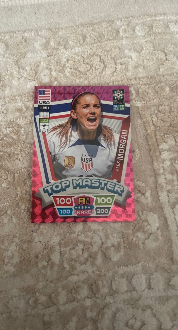Alex Morgan'un pastel tonlarda ve pembe renkli pop kültür rozeti. "100" ve "RARE" optik karakter tanıma detayları içerir. ⚽
