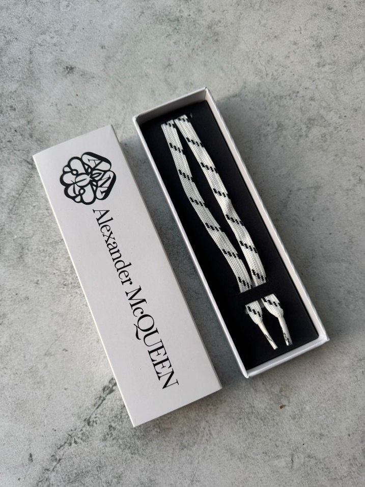 Alexander McQueen markalı, siyah detaylı beyaz erkek bağcıkları. Gotik tarzda, Parisli alt kültür etkisiyle tasarlanmıştır. Özel kutusunda.