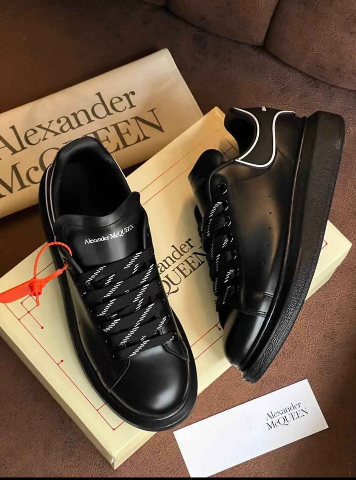 Alexander McQueen siyah bağcıklı erkek spor ayakkabısı, baskılı bağcıklar ve kauçuk taban ile sokak stili ve günlük kullanım için uygundur. Koyu tonlar rahat athleisure tarzına uyum sağlar.