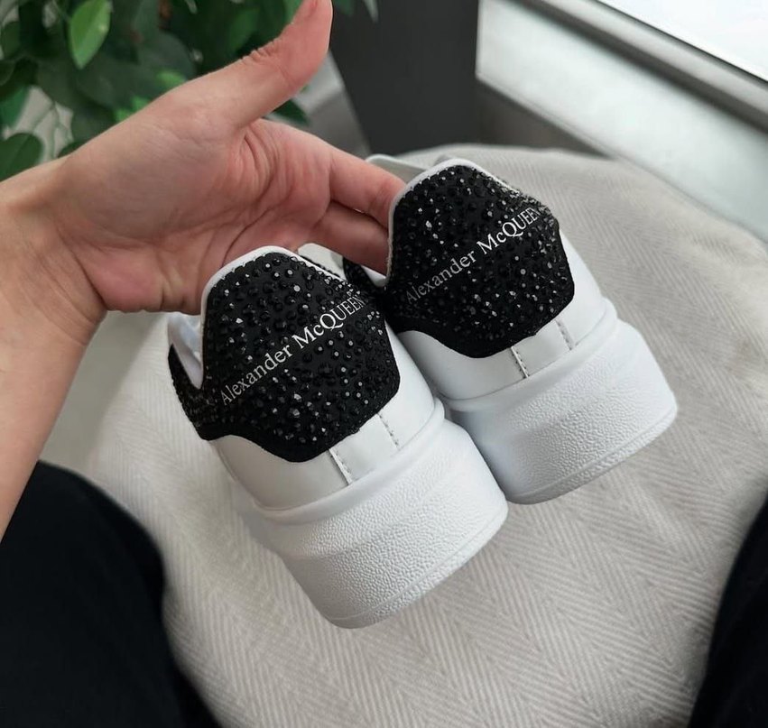 Beyaz kadın spor ayakkabısı, platform topuk ve cırt cırtlı kapanışa sahiptir. Topuk kısmında siyah taş detaylı koyu desenli tasarım bulunur. Kauçuk tabanlıdır.