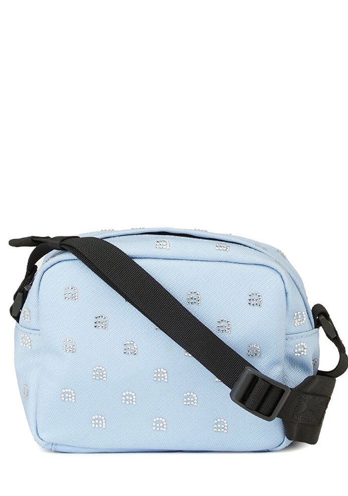 Limited Pastel mavi renkte, a taşlı desene sahip bebek çantası, siyah ayarlanabilir askıyla kolay taşınır. Seyahat için pratik ve şık bir seçenek.