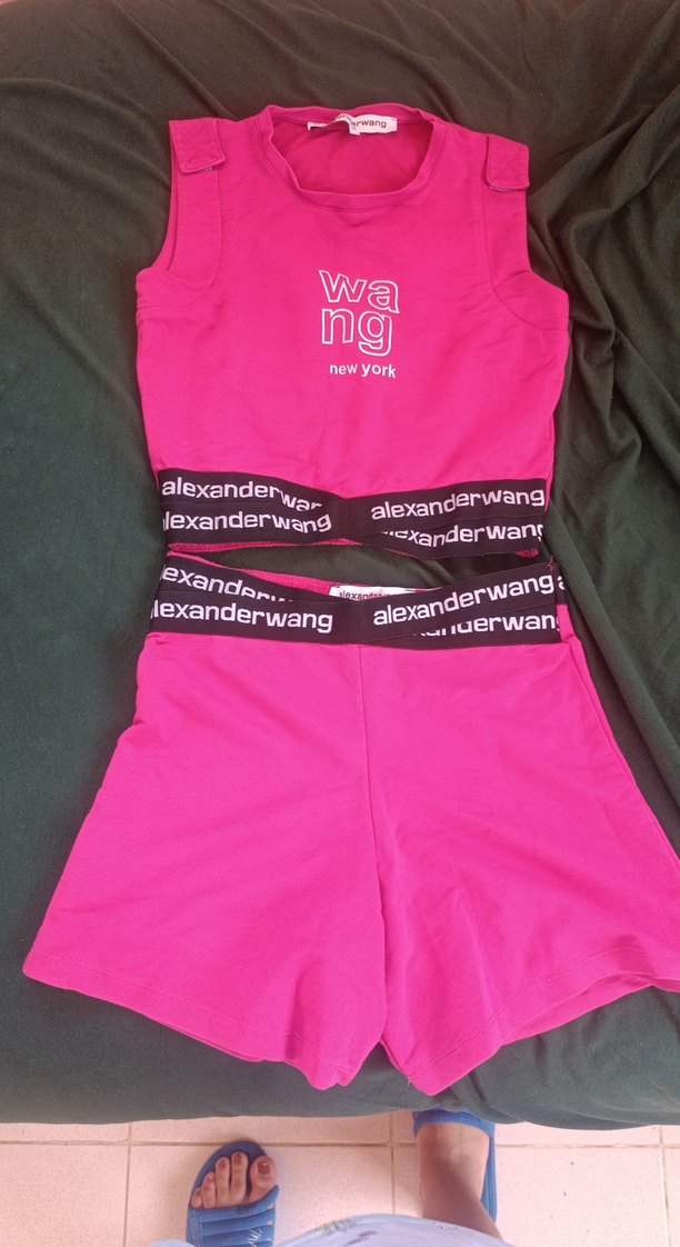 Dar kesim, askısız pembe mini spor tulum, straplez yaka ve baskılı logo detaylı. Alexander Wang yazılı kemerli, spor ve sokak stili için uygun. ♀️alt üst