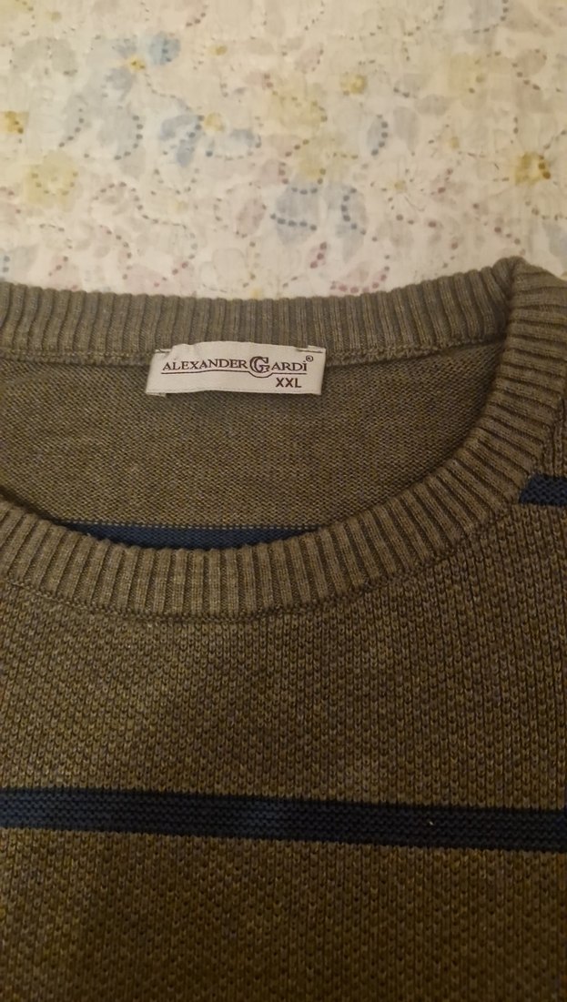 AlexanderGardi marka, standart kesim, yuvarlak yaka ve uzun kollu erkek haki üzerine lacivert çizgili triko kazak. Örgü yün kumaştan, gündelik sokak stiline uygun. Eşime almıştım, büyük geldi. Sadece bir kere giydi. Tertemiz durumda.