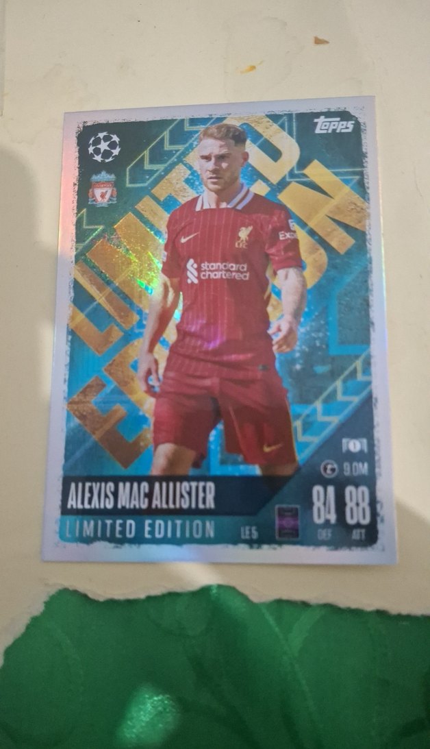 Canlı kırmızı renklerde, pop kültür tarzında sınırlı baskı Alexis Mac Allister rozeti. Oyuncu istatistikleri ve holografik detaylar içerir. ⚽