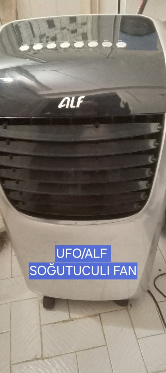 ALF markalı, soğutma özellikli gri fan. Hava sirkülasyonu ve ısı kontrolü için uygundur. UFO/ALF etiketiyle soğutuculu fan.