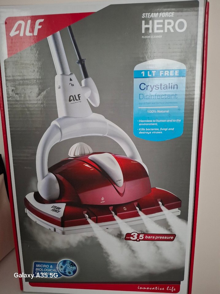 ALF STEAM FORCE HERO buharlı temizleyici, 3.5 bar buhar basıncı ve 1 litre Crystalin dezenfektan ile etkili temizlik sağlar, hediye alınmıştı manuel temizlik yapmayı tercih ediyorum, iki kez kullandım.
