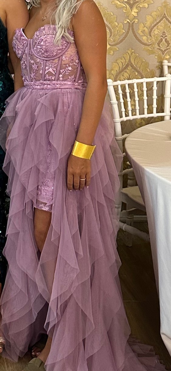 2025 yeni sezon. Mağaza fiyatı 15-17 bin. Uzun, Lila pembe renkli,(renk farklılığı ışıktan) straplez yaka ve kat kat fırfırlı bu gece elbisesi, bohem ve göz alıcı desenlerle tasarlanmıştır. Gecenin en göz alıcısı siz olun. Arkasına brit ip yaptırıldı 34-36 bedene olur. 1.55 boy 10 pound ayakkabı ve 50 kiloda giyildi