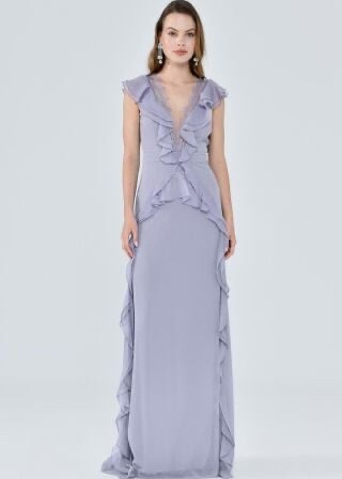 Ürün hiç kullanılmamıştır, etiketi üzerindedir. Açık bir lila rengindedir, maksi boydur. Eteğinin iki yanı yırtmaç detaylıdır. Göğüs kısmı dantellidir, ayrıca fırfırlar ile hareketlendirilmiştir.