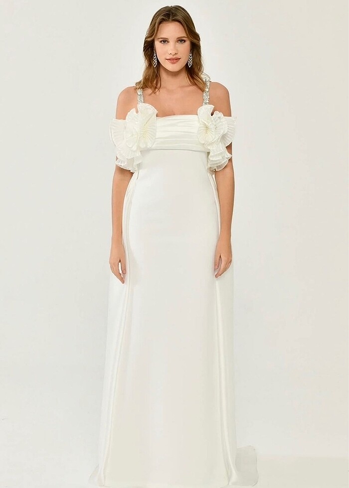 ürün nişanım için boyundan kısaltma yapılarak tadilat görmüştür midi boy yapıldı,kuyruk kısmı kendi boyunda çok şık ve farklı bir elbise. Model anlaşılması için mavi görseller eklendi elbise rengi beyazdır.