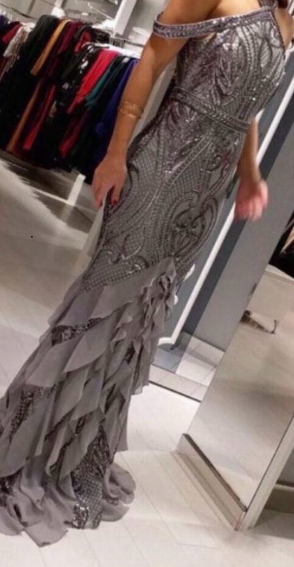 Uzun ve vücuda oturan gri abiye elbise,halter yaka, askılı kol ve desenli işlemeli detaylara sahiptir. düğünler için uygundur. Ölçüler: İki kol altı 40 cm Bel 35 cm kalça 45 cm