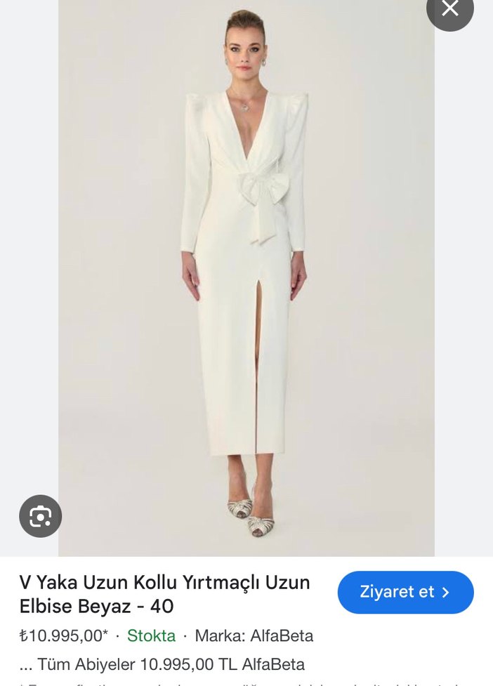 Beyaz uzun elbise, V yaka, uzun kollu 40 bedenim ama dar kalıp 44 beden o yüzden bir saat giyildi kuru temizlemede temizlendi pazarlık payı vardır