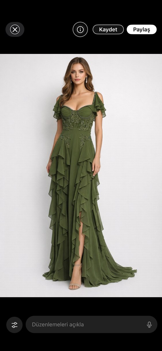 Yeşil renkli, uzun, nakışlı ve drapeli kadın abiye elbise. Straplez yakası ve fırfırlı kolları ile modern klasik bir görünüm sunar. Düğün için uygundur.