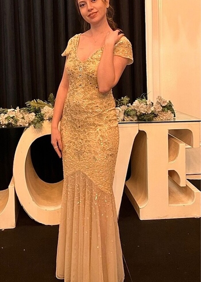 Alfabeta taşlı pullu abiye elbise ön kısımda hafif bir pul dökülmesi var ama belli olmuyor pazarlıı vardır 52 kiloda kullandım 160 boy 10cm topuklu ile