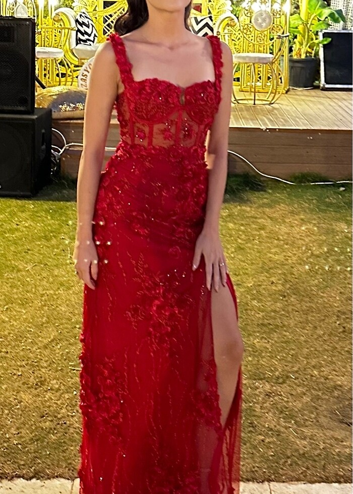Alfabeta Kırmızı Gül işlemeli Yırtmaçlı Abiye