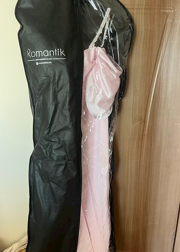 Fitted kesim, straplez yaka ve ince askılı pembe uzun elbise, drapeli ve baskılı kumaştan. Düğünler için uygun, 'Romantik' yazılı koruyucu kılıfla birlikte.