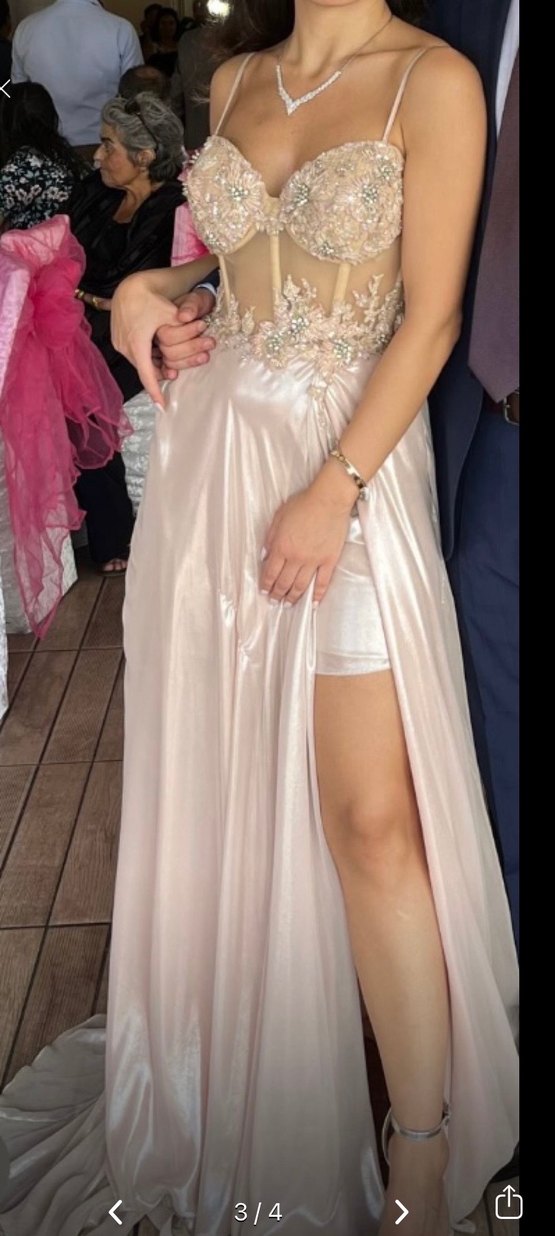 Parlak pudra pembe, renkli, işlemeli uzun nişan elbisesi. Vucüda oturan kesimiyle modern tarz.