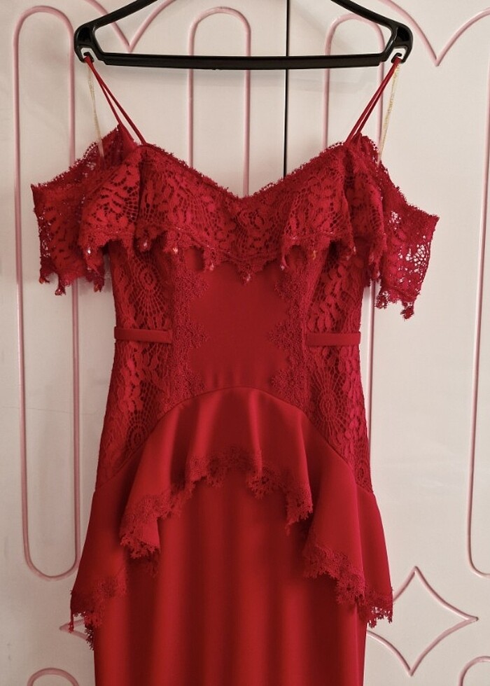 Sadece 1 defa kullandım. Sıfır beden 36 ile uyumludur. Elbise boyu 160 cm arkası hafif kuyrukludur.