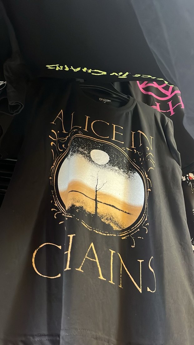 Bedenler mevcut Zincir detaylı, parlak baskılı Alice In Chains desenli siyah pamuklu hamile tişörtü. Kısa kollu, yuvarlak yaka ve bol kesim, parti için goth punk tarzında.