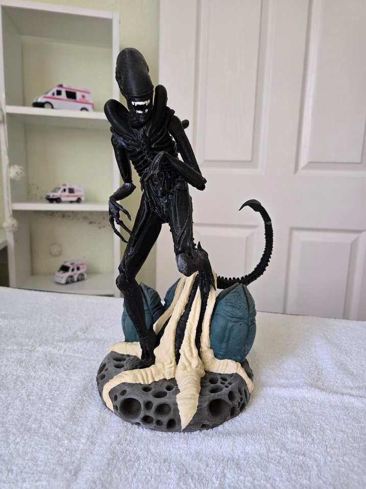 Karanlık siyah renkte, keskin pençeli ve uzun kuyruklu bir uzaylı aksiyon figürü. Organik dokulu detaylı bir taban üzerinde duruyor.