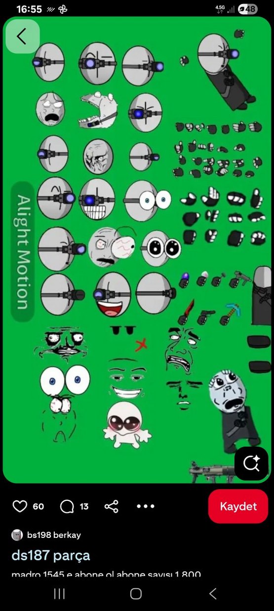 Çeşitli yüz ifadeleri, eller ve aksesuarlar içeren koyu tonlu khaki renkli animasyon figürleri seti. "AlightMotion" etiketiyle.