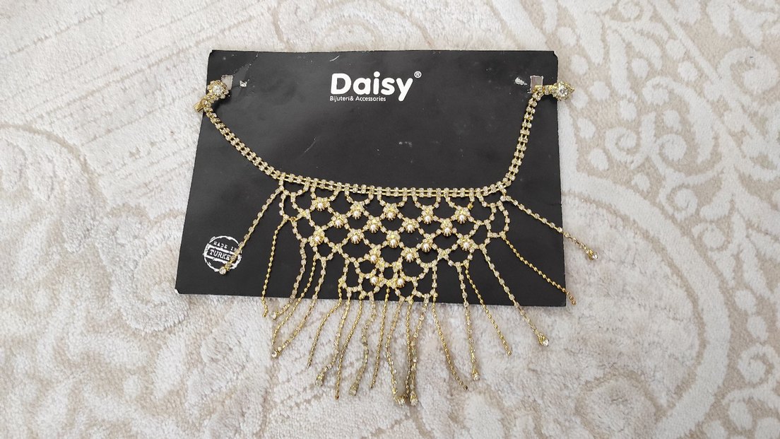 Altın renk işlemeli desenli, zincir detaylı aksesuar alın, omuz yaka için kullanılabilir