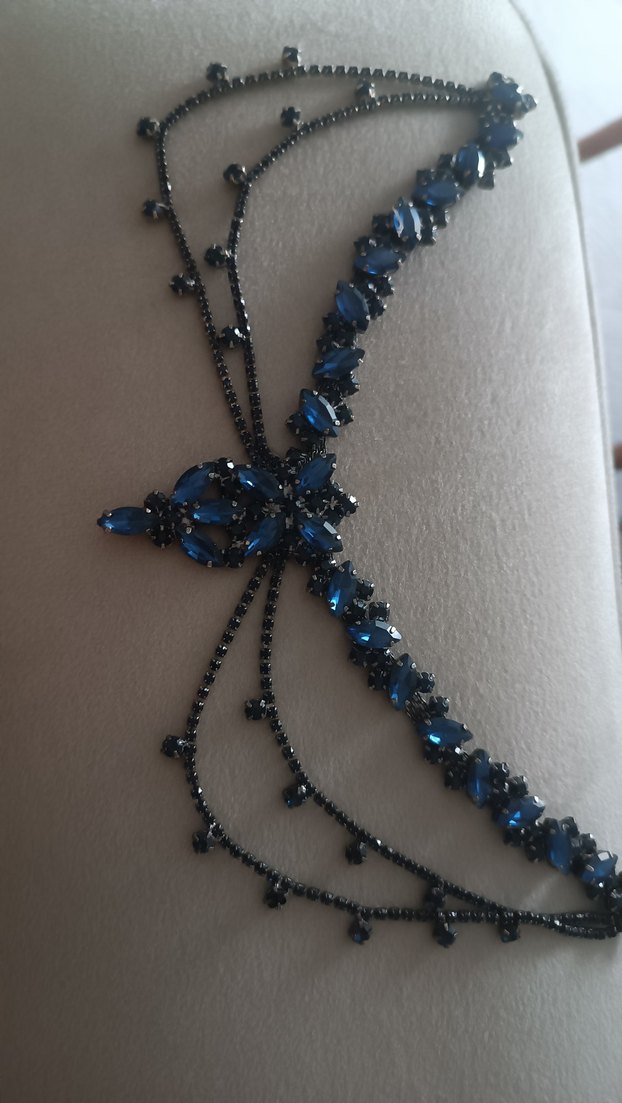 İşlemeli detaylara ve zincir süslemelere sahip koyu mavi gotik vücut zinciri, avant-garde düğün kombinleri için uygun.