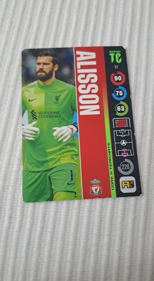 Alisson'un açık yeşil kaleci formasıyla yer aldığı futbol kartı. Performans istatistikleri ve takım logoları bulunur. ⚽