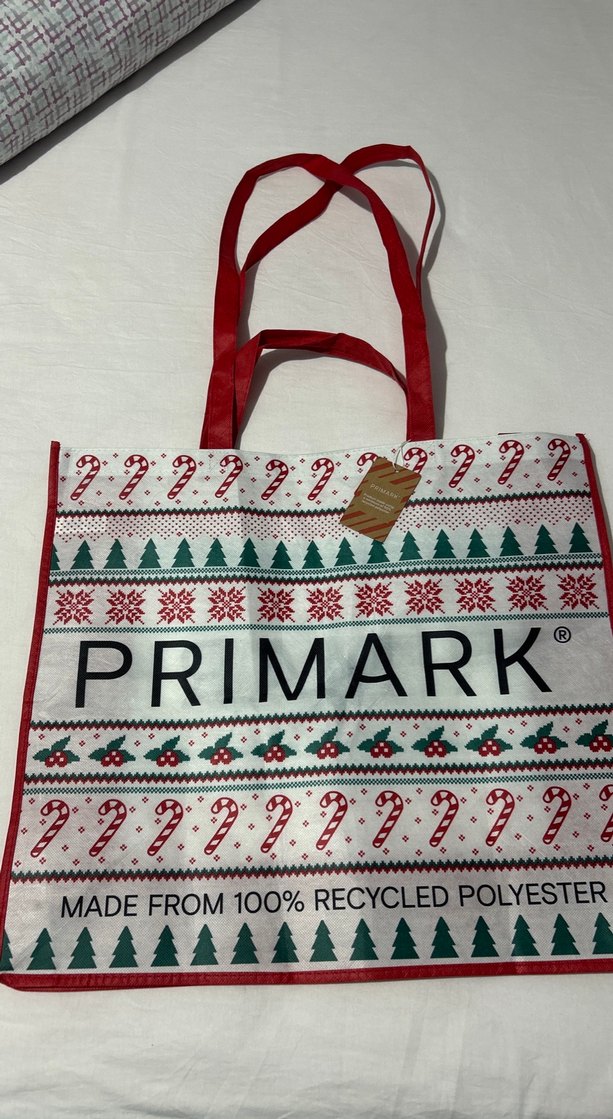 Beyaz zemin üzerine tatil desenli, örgü detaylı ve kırmızı saplı kadın tote çanta. Primark tarafından %100 geri dönüştürülmüş polyesterden üretilmiştir. 55x49x18 cm içine yastık sığabilecek kadar büyük, çift askılı