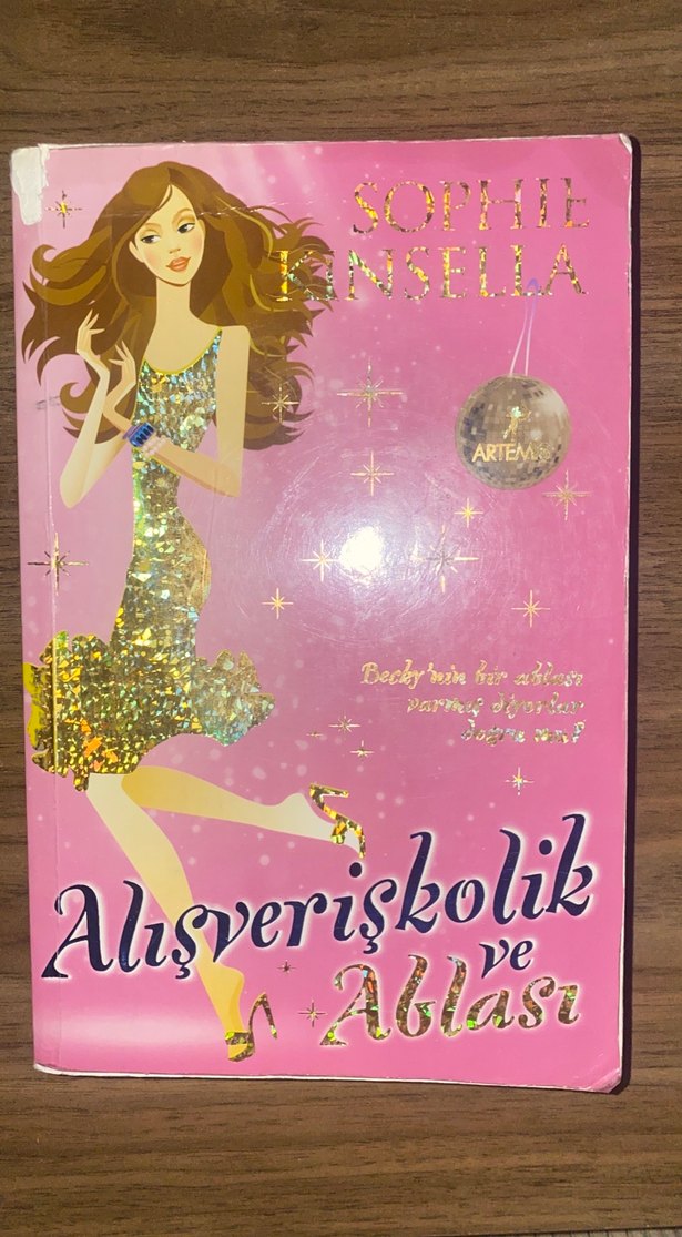 Sophie Kinsella'nın 'Alışverişkolik ve Ablası' adlı, parlak elbiseli bir kadının yer aldığı pembe kapaklı romanı.