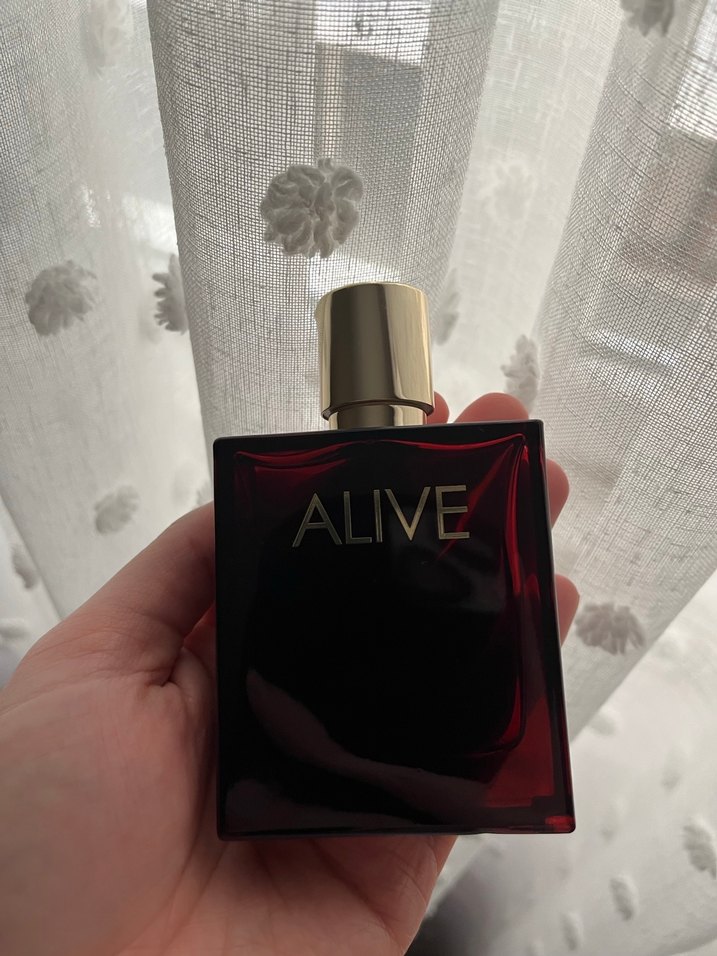 Altın kapaklı, koyu kırmızı şişede Alive kadın parfümü. Üzerinde "ALIVE" yazısı bulunur.
