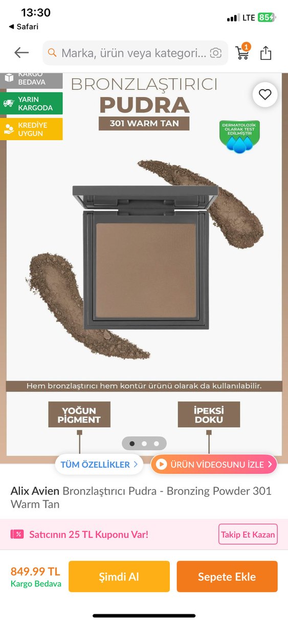 Alix Avien bronzlaştırıcı pudra, yoğun pigment ve ipeksi dokuya sahiptir. Hem bronzlaştırıcı hem de kontür ürünü olarak kullanılabilir. Dermatolojik testlidir. ☀️ 2 defa kullandım.