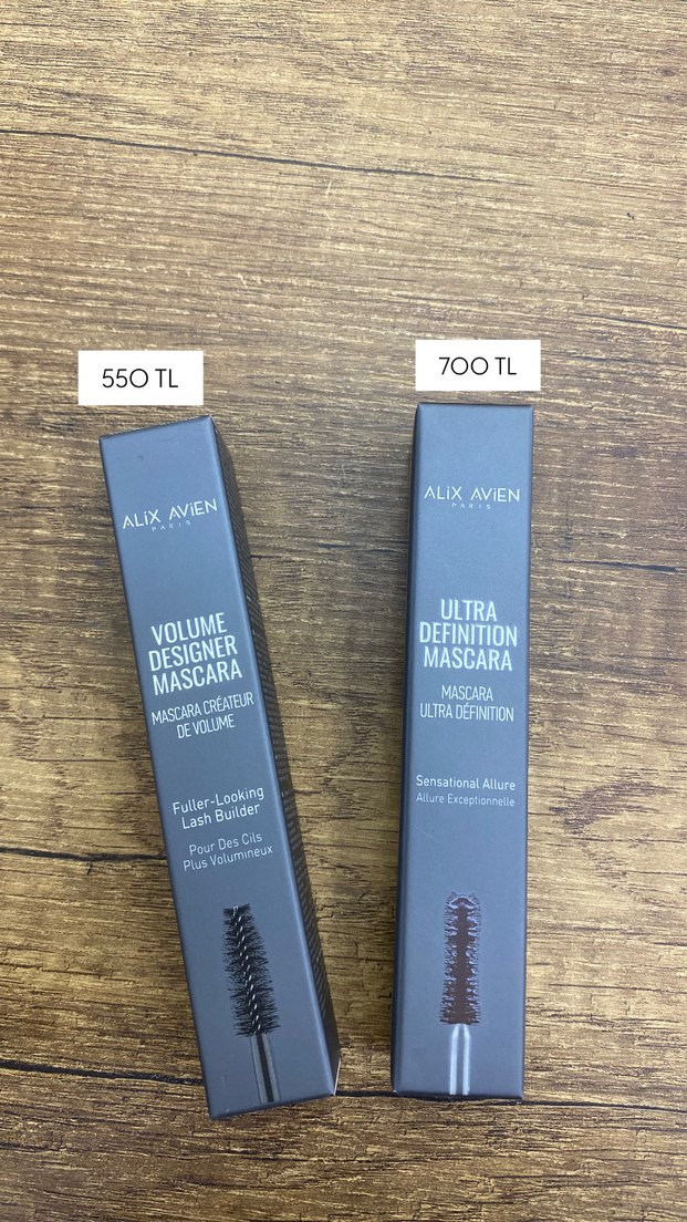 Alix Avien markasının bej ve gri ambalajlı, hacim ve ultra tanım için tasarlanmış iki maskarası. Fiyatlar 550 TL ve 700 TL. PAZARLIK PAYI VARDIR