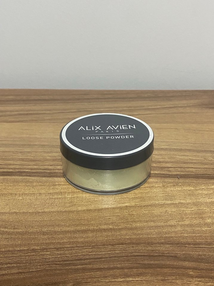 Alix Avien markasına ait, parlak bej renkte, cilde pürüzsüz bir görünüm veren loose pudra. ✨
