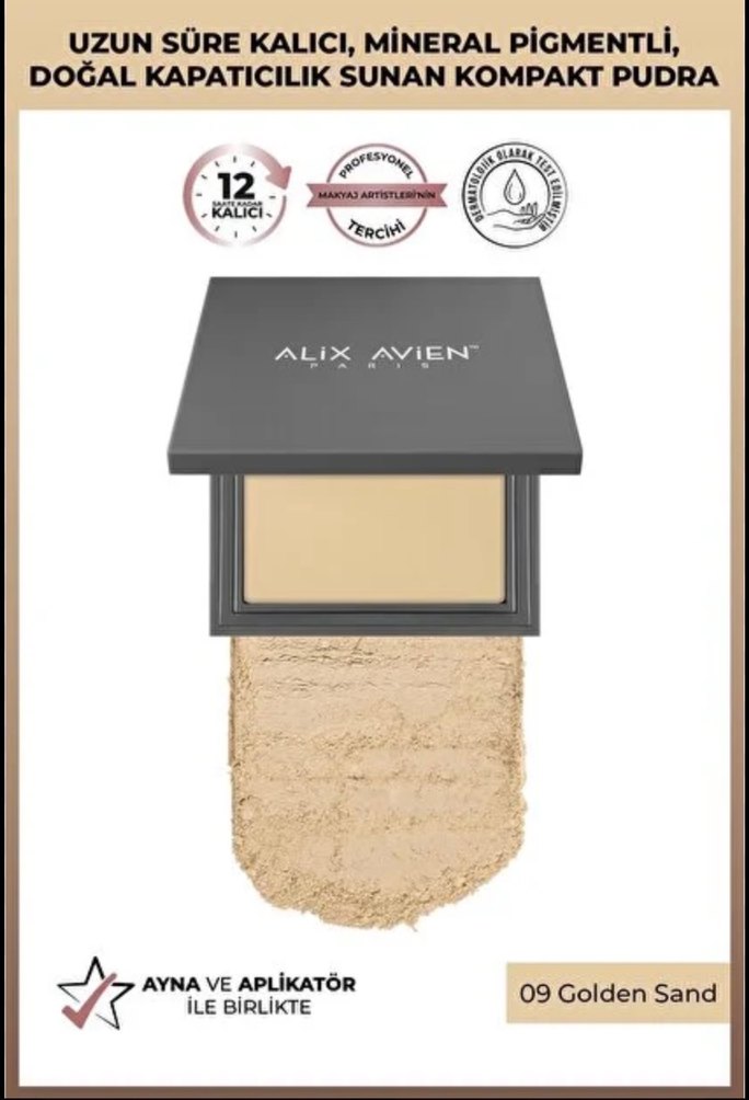 Alix Avien'in 09 Golden Sand tonundaki kompakt pudrası, uzun süre kalıcı, mineral pigmentli ve doğal kapatıcılık sağlar. Ayna ve aplikatör ile birlikte gelir. Orijinaldir hiç kullanılmamıştır