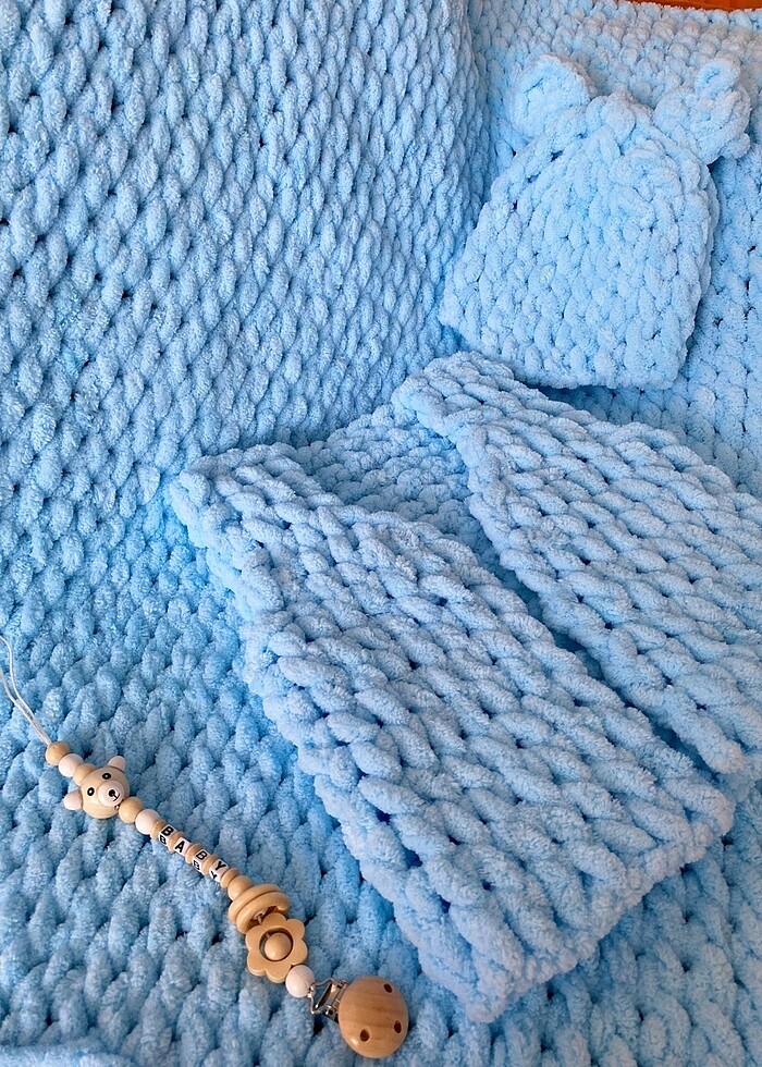 Set İçeriği; 90*90 Ayıcıklı Bebek Battaniyesi Bebek Yeleği Kulaklı Bebek Şapkası Emzik Zinciri Ürünlerimiz sizler için özenerek ve emek vererek yapılmaktadır. El işçiliği olduğu için sipariş süresi mevcuttur. Sipariş vermeden renk seçimi ve teslimat bilgisi almayı unutmayın. Ürünlerimiz el işçiliği olduğu ve size özel yapıldığı için sipariş verildikten sonra iptal veya iade yoktur.