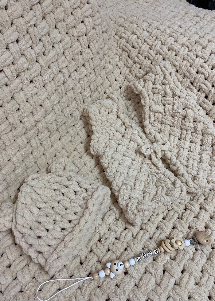 Set İçeriği; 90*100 Bebek Battaniyesi Bebek Yeleği Kulaklı Bebek Şapkası Emzik Zinciri *Dikkat* Ürünlerimiz sizler için özenerek ve emek vererek yapılmaktadır. El işçiliği olduğu için sipariş süresi mevcuttur. Sipariş vermeden renk seçimi ve teslimat bilgisi almayı unutmayın. Ürünlerimiz el işçiliği olduğu ve size özel yapıldığı için sipariş verildikten sonra iptal veya iade yoktur.
