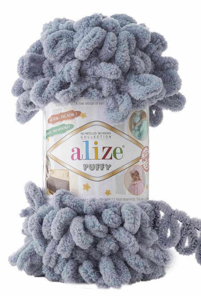 Alize Puffy, iğne ve tığ kullanmadan yumuşak, halka dokulu gri peluş iptir.