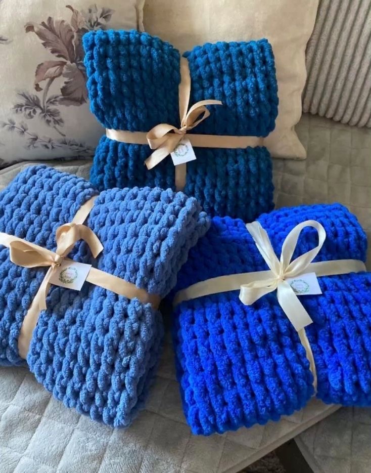 Farklı mavi tonlarında, yumuşak ve dokulu örgü çocuk battaniyeleri. Her biri kurdele ile bağlanmıştır.