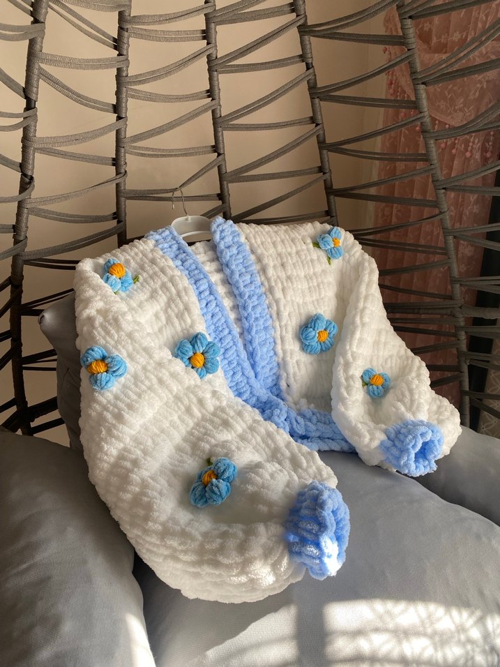 Bohem tarzda, uzun kollu, beyaz pastel renkli triko, mavi nakışlı çiçek detaylı bol kesim kız hırkası.