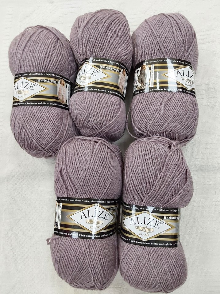 Beşli paket halinde Alize Superlana Klasik yün iplik, yumuşak lila tonunda, örgü ve el işleri için uygun .