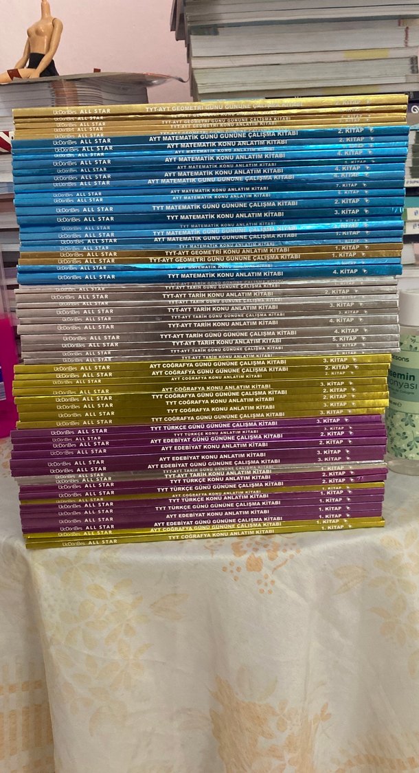 All Star markalı TYT ve AYT matematik, geometri, tarih, coğrafya, Türkçe konu anlatım ve soru kitapları seti.bu urunun 45 tanesi sifir hic kullanilmadi kalanlari az kullanilmistir.esit agirlik setidir uygulamada konu anlatimlari cozumleri herseyi mevcut.uygulamasi da cok guzel.