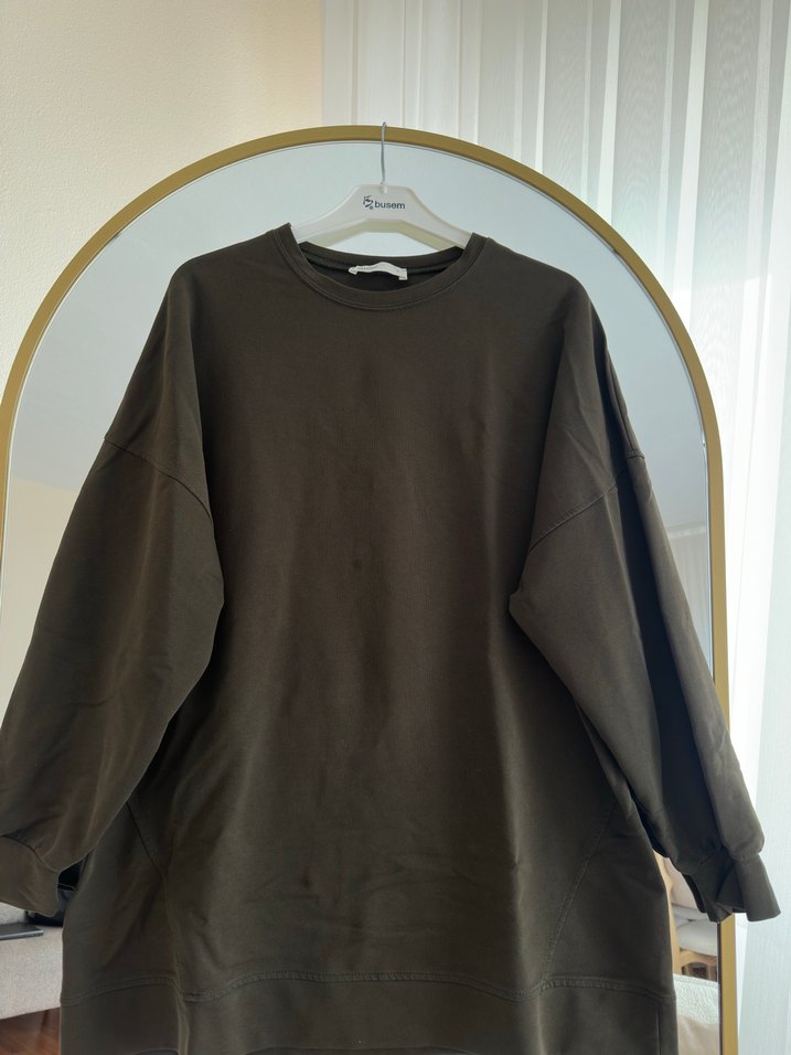 Kadınlar için uzun kollu,bol kesim, haki renkli sweatshirt. Uzun boyu ve sade tasarımıyla günlük sokak modasına uygun, minimalist ve zahmetsiz şıklık sunar. S bedendir fakat be 65 kilo ile giydim rahat kalıptır sorunsuz ve 1 kez giyildi