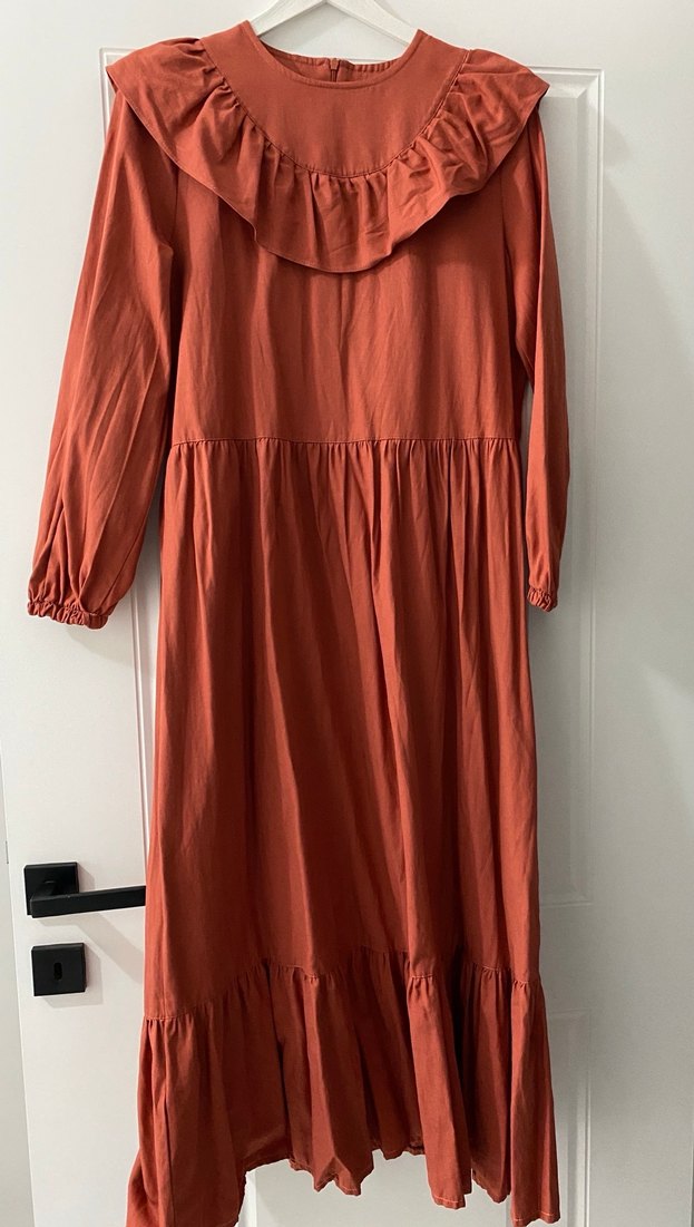 Bol kesim, uzun kollu turuncu elbise, yakalı ve fırfır detaylıdır. Bohem tarzda, desensiz ve günlük kullanıma uygundur.