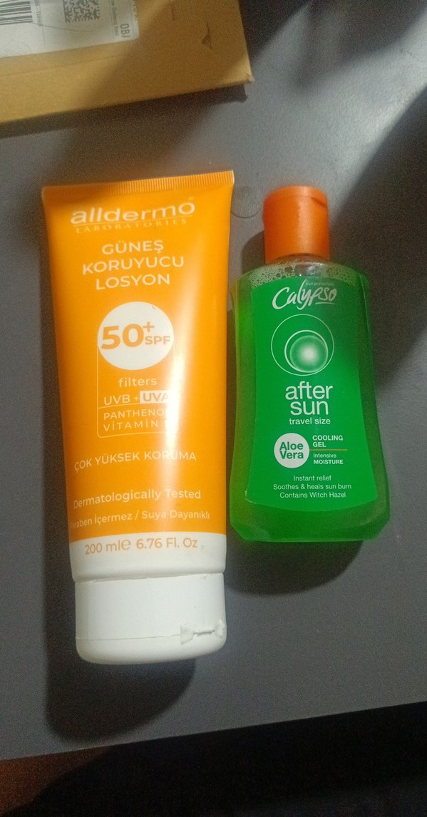 Alldermo SPF 50+ güneş koruyucu losyon, UVB-UVA filtreleri ve E vitamini ile yüksek koruma sağlar. Calypso after sun jel, aloe vera ve ebegümeci içerir, cildi yatıştırır ve nemlendirir. Seyahat boyu.Alldermo ürünüm az kullanılmıştır. Diğeri hediyedir