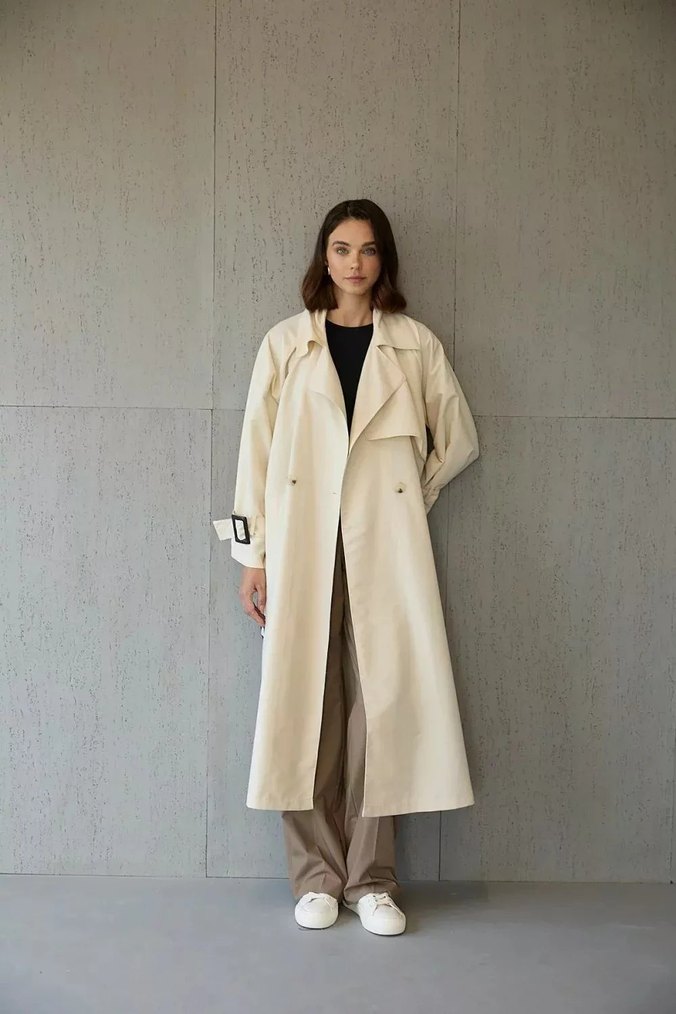 Bej renk, uzun kollu, notalı yaka detaylı uzun trençkot. Sentetik kumaştan, rahat kesimli ve günlük kullanıma uygun sade şıklık sunar.
