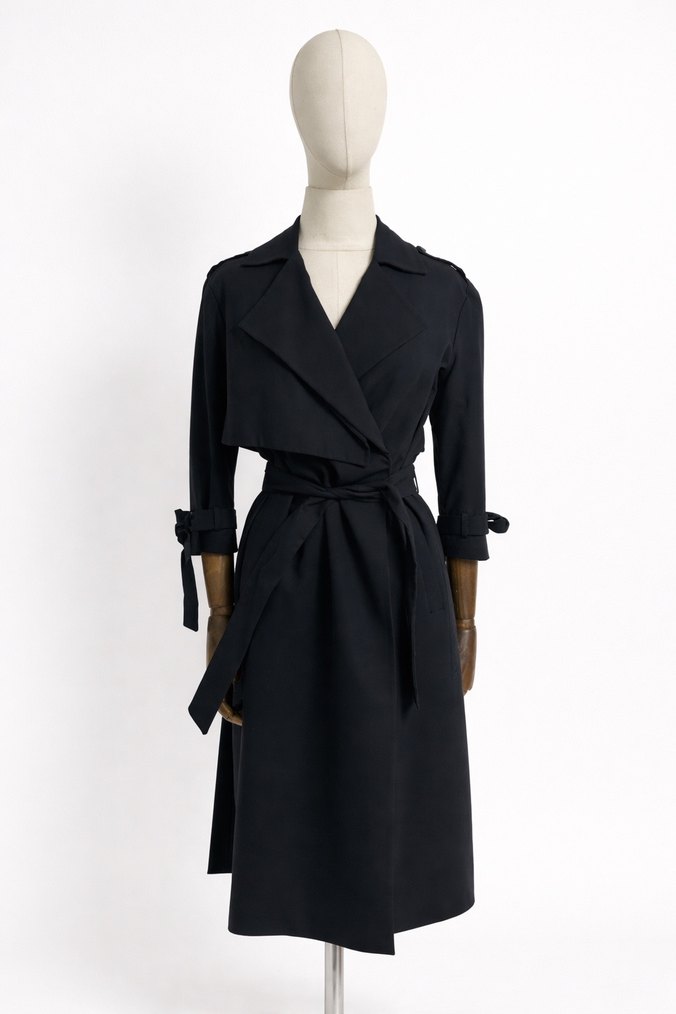 Kemerli bel ve notched yaka detaylı, uzun siyah trençkot. Strappy kollu, regular fit ve sentetik kumaştan yapılmıştır. Ofis kullanımı için klasik şıklık sunar.